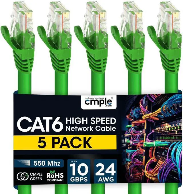 Pack of 5 - Cat6 500MHz UTP Ethernet LAN Network Cable? 15FT Green High-performance Cat6 ethernet patch cables are designed with extremely well-matched components for outstanding and very low return loss, providing lower crosstalk, and a higher signal-to-noise ratio. They support frequencies of up to 550 MHz and are suitable for high-speed 10Gbps internet connection. Cat6 Ethernet patch cable provides universal connectivity for everything from computers, printers, servers, routers, and switch boxes to network media players, network-attached storage devices, VoIP phones, IP cameras, gaming consoles, Ethernet extenders, PoE devices, and more Our Cat6 cables are designed extremely well with precision twisting, rigorous research, and testing, resulting in higher bandwidth.