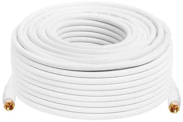 RG6 F-Type Coaxial 18AWG CL2 Rated 75 Ohm Cable 100ft. white. Ideal for any video sources with F-type output connections. RG6 F-Type Coaxial 18AWG CL2 Rated 75 Ohm Cable - 100 Feet, White These cost-effective high-performance cables give you maximum video quality in a super-thin design. Low-loss 75ohm pure copper wire and foam dielectric ensure optimum picture resolution and color. A foil and braid shield protect against unwanted noise and interference. The molded connectors attach to an ultra-flexible jacket, and allow for easy installation. Heavy-duty connectors ensure long-lasting, high-performance connections.
