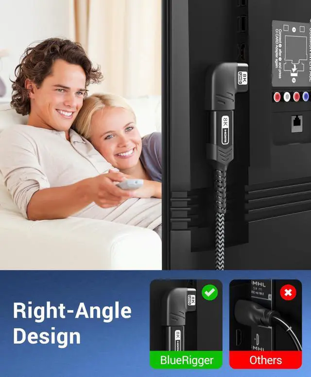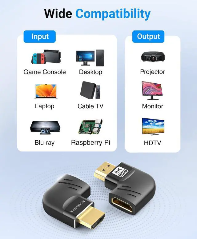 HDMI ADAPTER: BlueRigger 90 degree HDMI adapter supports resolution up to 8K 60Hz, 4K 120Hz, 2K 240Hz, 48 Gbps ultra high speed, eARC, dynamic HDR, 3D, HDCP 2.3, Dolby Vision, HD Dolby 7.1 and Dolby Atmos. The bi-directional HDMI male to female adapter is perfect for your home theater, office or conference room ^^ L-SHAPED 90D & 270D
