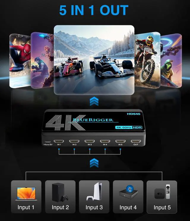 HEIGHTENED VIEWING EXPERIENCE: BlueRigger HD545 video switcher supports 4K 60Hz and 2K 120Hz, HDR10+, HDCP 2.3, 3D, and 18Gbps high-speed transmission. Ideal for immersive gaming sessions, movie nights, and home theater and office use ^^