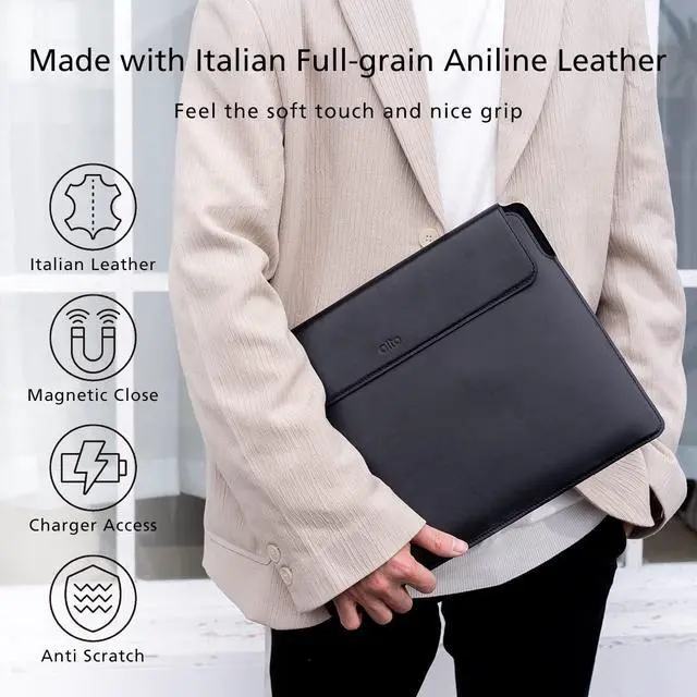 • [Italian Full-grain Aniline Leather] Premium Italian Leather is soft to the touch and easy to grip. Natural leather aging process develops a unique personal color. Inner soft mircofiber prevents your macbook from scratches. 238 grams lightweight design.