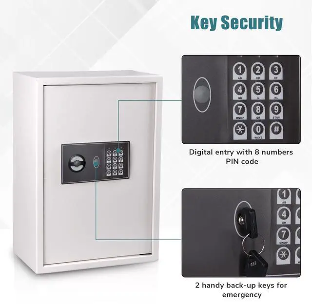 Features: - Large Capacity - This Electronic Key Safe features a large size with 3 interlayers and a total of 245 key hooks, enabling you to keep a large number of keys in a single secure location- Secure Access - Features standard digital entry with an 8-number PIN code for optimum security, along with 2 handy back-up keys for reasonable accessibility in emergency situations- Smart LED Indicators - Equipped with 3 indicators including green light for correct password and yellow light with beeps for incorrect password, and automatically disables access for 20 minutes after keying in an incorrect password for 3 consecutive times, for exceptional protection from intruders- Durable & Easy to Install - Made of a solid cold-rolled steel construction for great strength, durability and resistance to rust, corrosion, impact and scratches, while including a full set of screws for easy installation- Wide Application - Suitable for property managers, car dealerships and repair shops, building concierge services, valet parking services, or individuals who have a lot of keys, enabling them to store a large number of keys securelySpecifications: - Overall