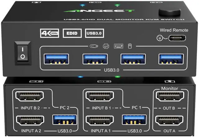 HDMI KVM Switch 2 Monitors 2 Computers 4K@60Hz 2K@144Hz, EDID Simulation, ANGEET Dual Monitor KVM Switch with 4 USB 3.0 Port for Keyboard Mouse, 2 Monitors KVM Switches with Wired Remote and USB Cable