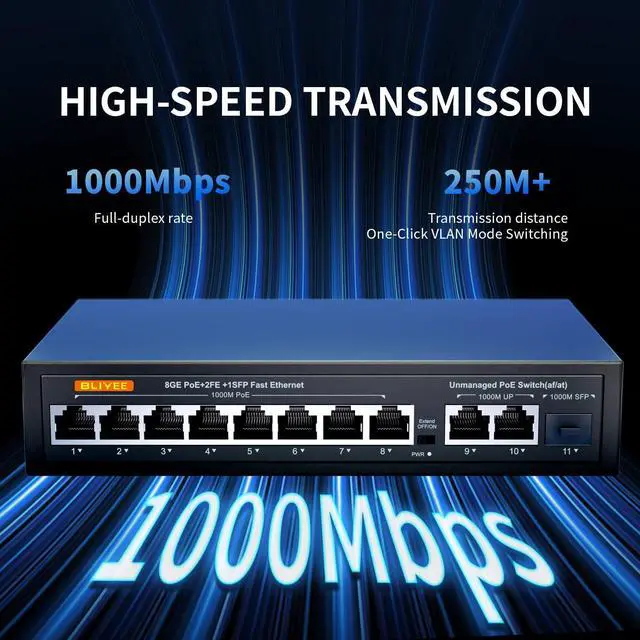 [(Efficient Data Transmission)] 8x PoE+ ports, 2*1000M Uplinks with 1x 1000M SFP Slot, providing up to 30W per port, total PoE budget 240W.