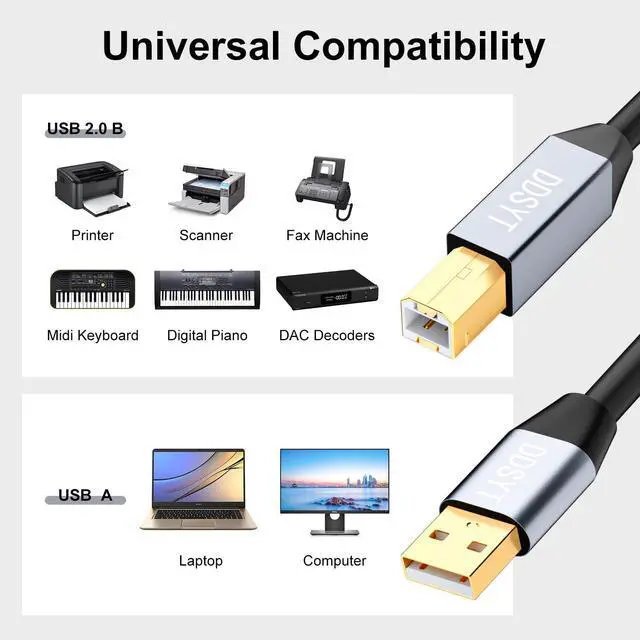 Ideal Printer Scanner Cable: DDSYT USB 2.0 printer cable is ideal for connecting your scanner, printer, server, hard drive, camera, piano, and other USB b devices to a laptop, computer (Mac/PC), or other USB-enabled devices for data transfer.