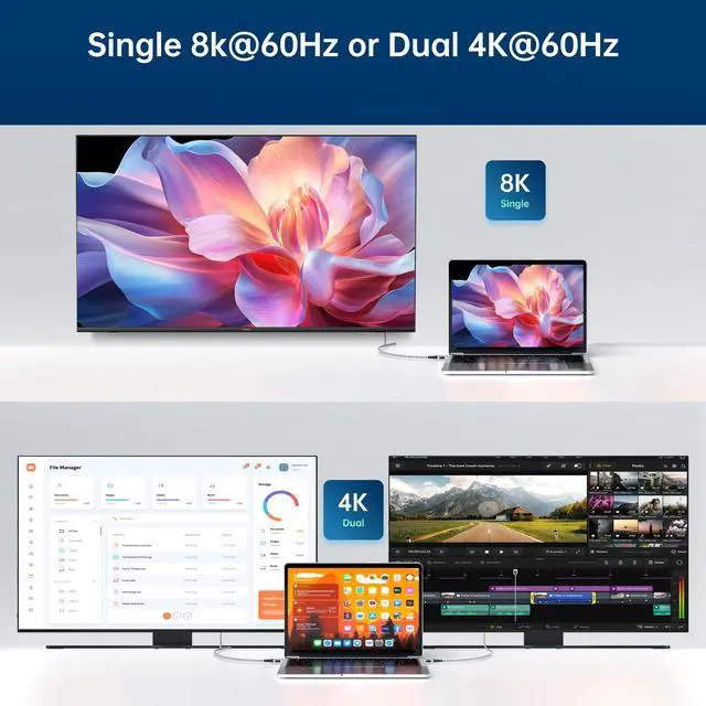 8K@60Hz & Dual 4K Display: 40Gbps for Thunderbolt 5 cable 10ft can run 8K@60Hz / 30Hz / 5K@60Hz / 4K@144Hz on a single screen and dual 4K@60Hz. With support for 8K at 60Hz resolution, this USB4 V2 cable 10ft delivers stunning visuals and crystal-clear audio for an immersive multimedia experience. Experience gaming like never before perfectly work for the Thunderbolt 5 Cable, which supports gaming in 4K@144Hz, providing smooth and lag-free gameplay.