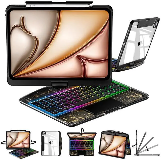 CNAIDUNR Touch 360degRotatable Keyboard Case for iPad 10th Generation, Clear Hard PC Back, Trackpad, Backlight &Pencil Holder, 7 Color Backlight Keyboard Case, Transparent Black