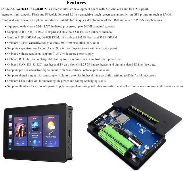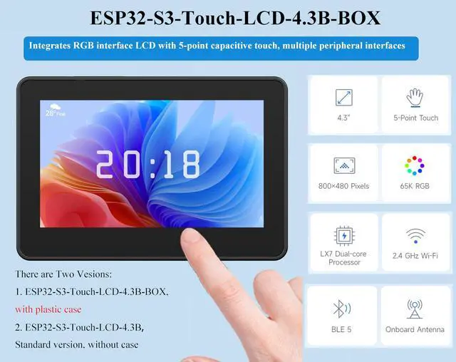 ESP32-S3-Touch-LCD- 4.3B -BOX is a microcontroller development board with 2.4 G H z W-i--F--i and BLE 5 support, integrates high-capacity Flash and PSRAM. Onboard 4.3 inch capacitive touch screen can smoothly run GUI programs such as LVGL. Combined with various peripheral interfaces, suitable for the quick development of the HMI and other ESP32-S3 applications.