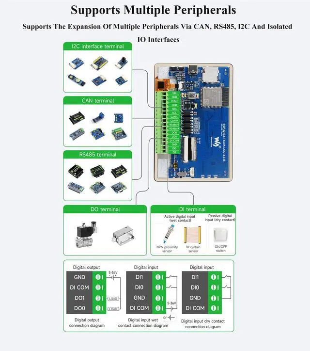 Onboard CAN, RS485, I2C interface and TF card slot, GH 1.25 2P battery header and digital isolated IO interfaces, etc.
