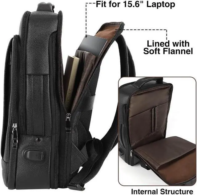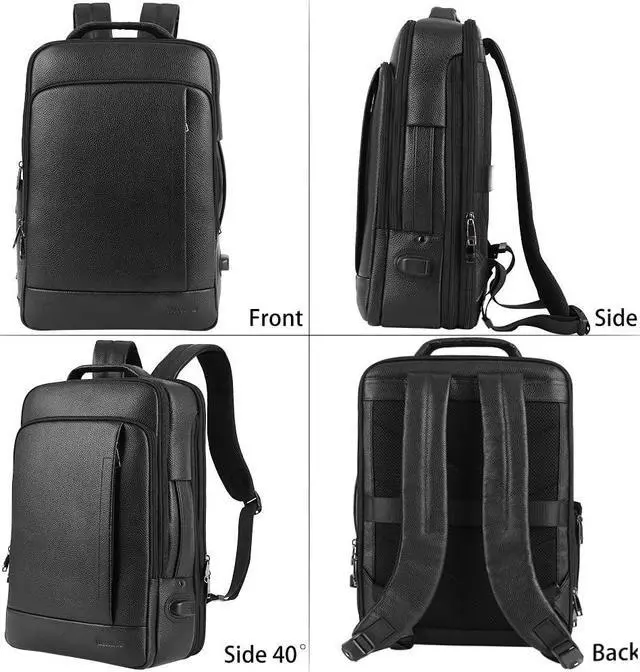 Wesccimo Full Grain Genuine Leather Backpack for Men Multi-Functional 15.6" Laptop Backpack with USB Charging, Black Convertible Business Travel Backpack Work Rucksack Daypack