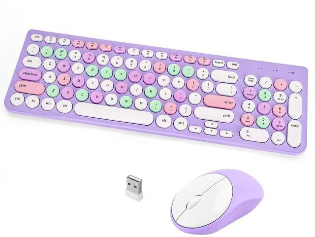 Wireless Keyboard and Mouse Combo, Retro Typewriter Wireless Keyboard with Round Keycaps, 2.4GH z USB Cute Wireless Keyboard Mouse for Computer, Desktop, Laptop (Purple Colorful)
