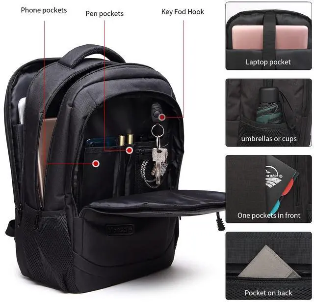 LARGE CAPACITY&MANY POCKETS: This backpack has two main compartment pockets. One separate laptop compartment holds 15.6 Inch Laptop as well as 15 Inch, 14 Inch and 13 Inch Mac book or Laptop. The other one packing compartment with 3 open pockets is roomy for daily necessities and tech electronics accessories. Front compartment with zipper pockets and pen pockets; 2 small elastic mesh side pockets; 1 rear padded pocket. Make your items organized and easier to find.