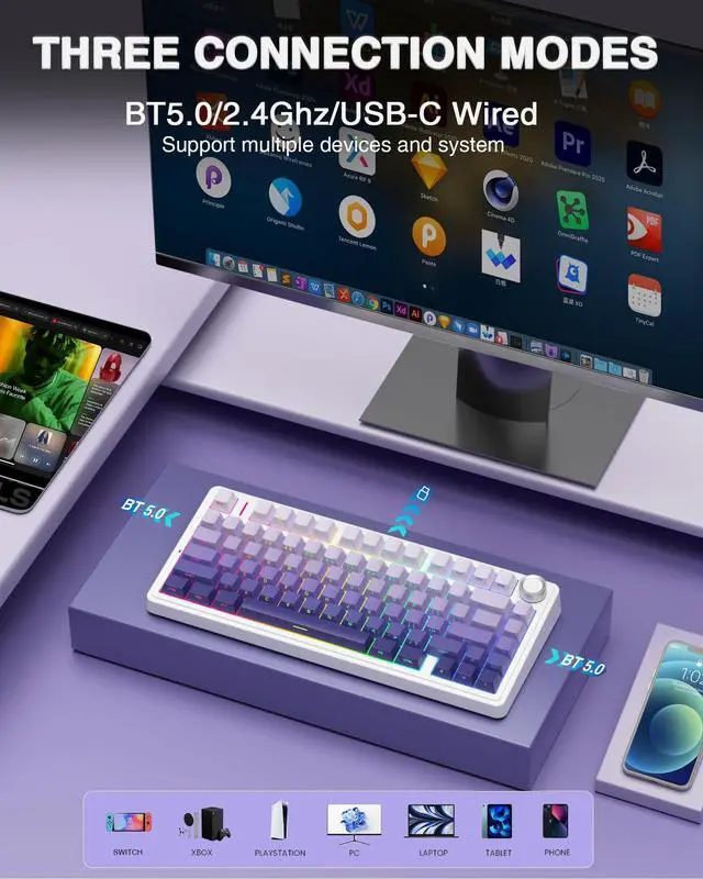 Tri-mode Connection Keyboard: AULA F75 Pro wireless mechanical keyboards work with Bluetooth 5.0, 2.4GHz wireless and USB wired connection, can connect up to five devices at the same time, and easily switch by shortcut keys or side button. F75 Pro computer keyboard is suitable for PC, laptops, tablets, mobile phones, PS, XBOX etc, to meet all the needs of users. In addition, the rechargeable keyboard is equipped with a 4000mAh large-capacity battery, which has long-lasting battery life