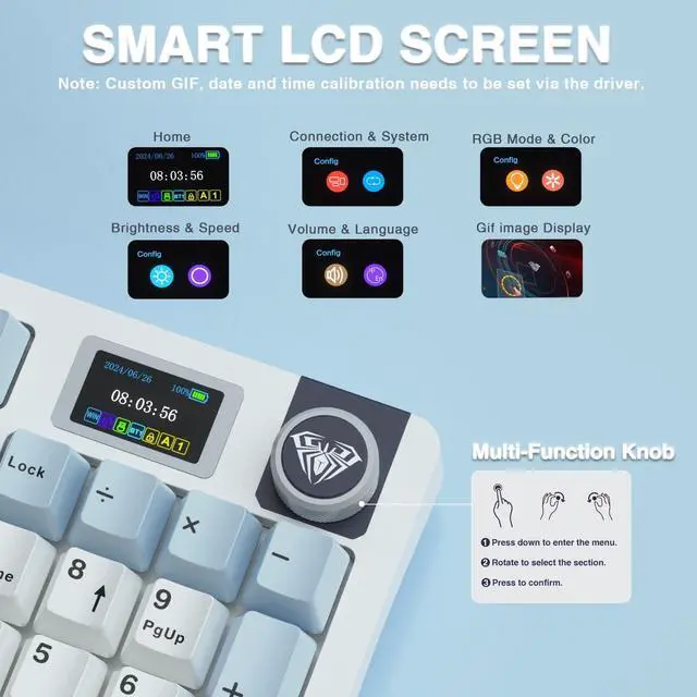 Smart LCD Screen & Multi-function Knob: Stylish AULA S98 Pro wireless mechanical keyboard with smart LCD screen and multi-function knob will lead the new trend. The screen homepage displays various information such as date, time, battery level, system, connection mode and status indicator. By rotating or pressing the multi-function knob, you can adjust the system, connection mode, volume, RGB light mode, language and screen image/GIF(Note: You need to download the software under windows system a