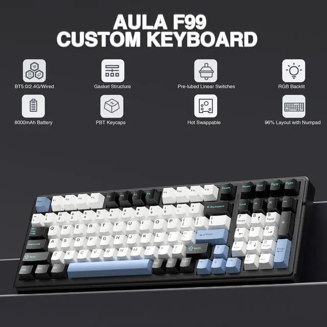 Multi-Device Connection: Aula F99 wireless mechanical keyboard provides three connection methods, including BT5.0, 2.4GHz wireless mode, and USB wired mode. It can be connected to up to five devices at the same time, and switch between them easily by FN and key combination keys. No limits about your keyboard connection to meet the needs of work, gaming, and study
