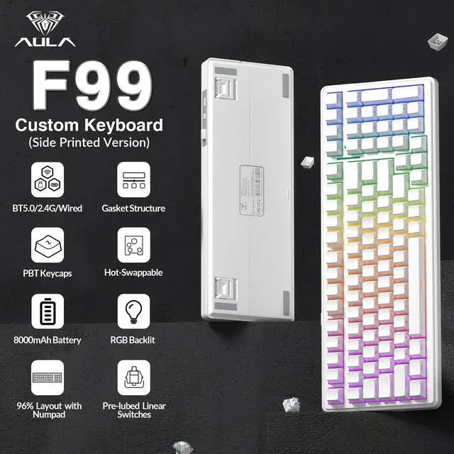 Hot-Swappable Custom Keyboard: The F99 mechanical keyboard allows you to freely replace switches and keycaps (tools included). Its hot-swappable PCB supports easy, solder-free replacement of both 3-pin and 5-pin switches. Equipped with factory-pre-lubed linear switches, this computer keyboard provides a smooth typing feel, fast response, and pleasant creamy mechanical sound, making it an excellent choice for office and games ^^ Gasket-Structure and PCB Single
