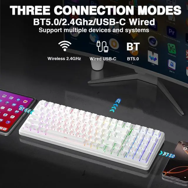 Multi-Device Connection: The F99 wireless mechanical keyboard supports triple connectivityBT 5.0, 2.4GH z wireless, and USB-C wired. It pairs with up to five devices simultaneously, allowing seamless switching between them with simple FN shortcut keys. Enjoy ultimate flexibility for work, gaming, and study ^^