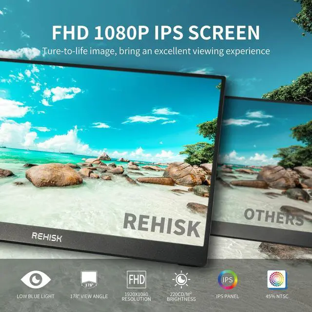 1080P FHD portable monitor. The ReHisk portable screen featured a 15.6 '' advanced IPS eye care panel, see everything as it's meant to be with realistic picture and vivid color across a wide 178 viewing angle. AMD FreeSync technology eliminates screen stutter, while the low blue light efficiently optimize eye comfort. ^^ Wide compatible external monitor. The Rehisk portable monitor comes with two USB-C ports and a Mini-HDMI port that easily supports laptops, PCs, smartphones, PS4/PS5, XBOX, Nintendo Switch. The single USB-C cable delivers power, data, video all at once, cutting the clutter and saving the space.