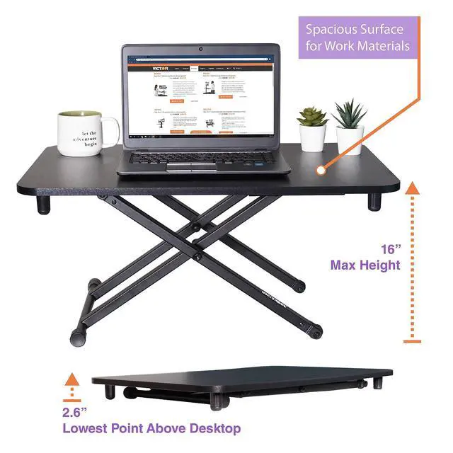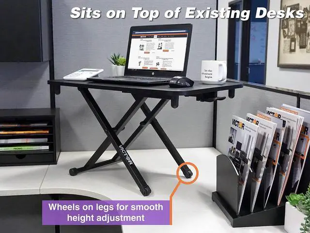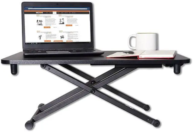 The Victor DCX129 is specifically designed for laptop users that want the versatility and ease of a transportable standing desk. Perfect for use at home or in the office, this easy-to-use space-saving laptop desk riser quickly raises to 16 with the squeeze of a lever. The adjustment from sitting to standing is smooth and effortless due to the two wheels on the legs. The 28.75 wide by 18.5 deep durable and scratch-resistant melamine work surface provides plenty of space to meet your needs. It is ready to use out of the box and takes seconds to setup.