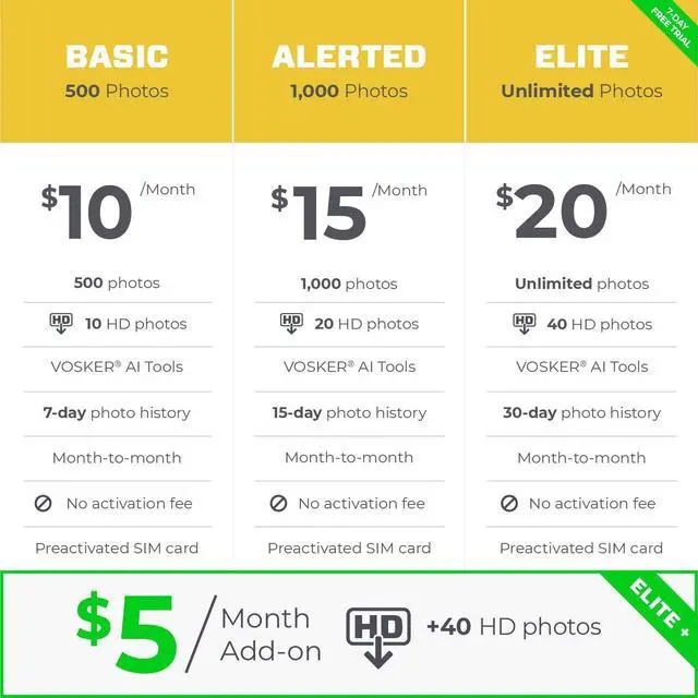 ^^ SIM CARD INCLUDED - Just setitup and letitgettowork. No need to purchase a SIM card from a third-party service provider, all VOSKER cameras come with a preactivated SIM card for an easy activation. Monthly plan starts at $10/mo. for 500 alerts, $15/mo. for 1000 alerts or $20/mo. for unlimited alerts. Save 10% with annual billing. Free 7-day trial at activation. ^^ THE POWER OF AI - VOSKER SENSE AI Image Recognition helps identify potential threats or security risks with simple filtering options that make focusing on security of your target location easier than ever, even when youre on the go.
