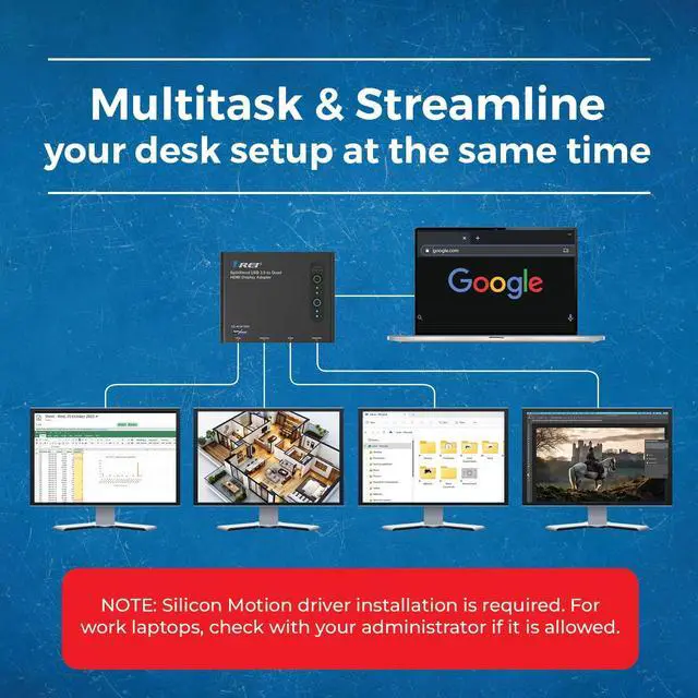 SILICONMOTION DRIVER Installation Required and 5V power is required (included adapter) - On work computeres please check with your administration if its allowed. Ideal for web and productivity software.