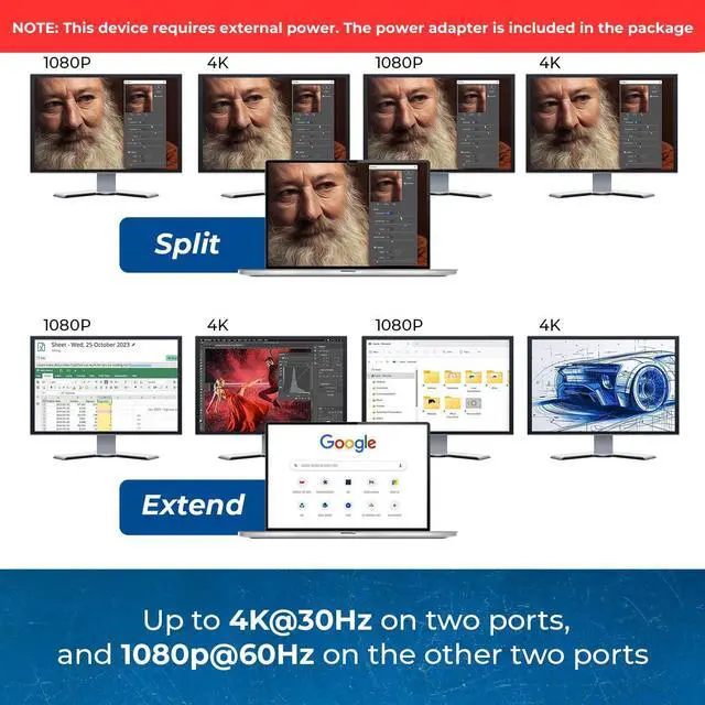 SPLITEXTEND - Split and Extend your Monitor to work twice as fast. With this adapter you will able to plug 2 HDMI Monitor Display to your Laptop or Desktop to get Extended Display. It will allow you to display 5 separate screen including your laptop screen. Video upto 4K @ 30Hz Resolution on two ports and upto 1080p @ 60hz on the other two ports.