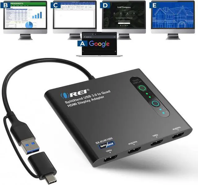 OREI SplitExtend HDMI Splitter Extended Display for Quad Monitor - Multi-Monitor Display 5 Separate Screens - USB-C Adapter to HDMI 2.0, 4K@30Hz Outputs - Windows and Mac Compatible