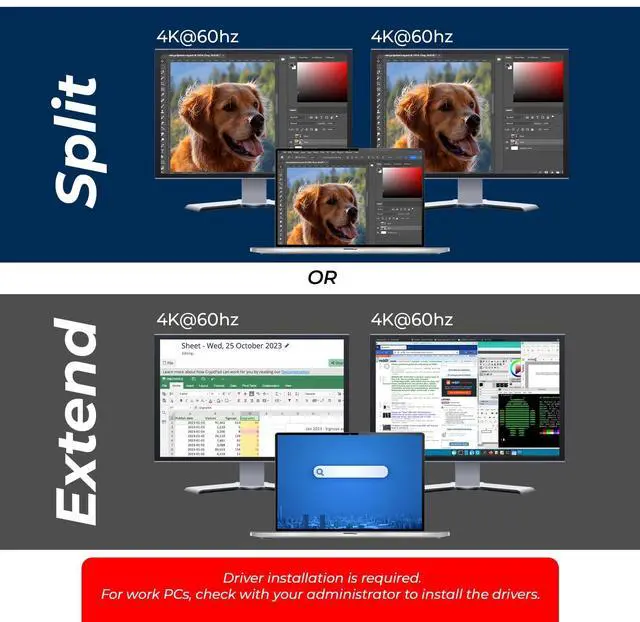 NOTE: This adapter will not work with macOS version 10.13. 4 to 10.13. 6; We recommend users to update to 10.14 or later to ensure compatibility with DisplayLink; Driver required for macOS and Windows; Auto-driver install with ChromeOS. DISPLAY LINK DRIVER INSTALLATION REQUIRED. Ideal for web and productivity software. Not recommended for gaming, graphics-intensive or design work. Also it doesn't support playback of HDCP-protected content on sites like Netflix and Hulu. and others This HDMI extender for dual monitors can be easily connected to USB-C, USB-A 3.1, or Thunderbolt 3/4, USB 4 devices.