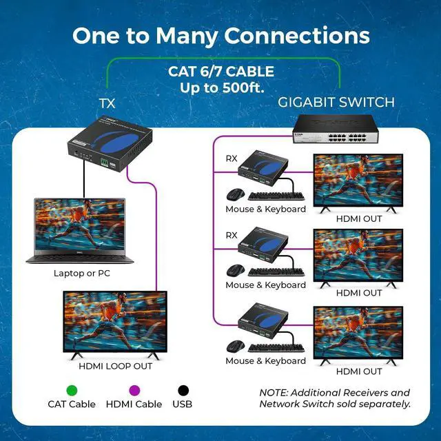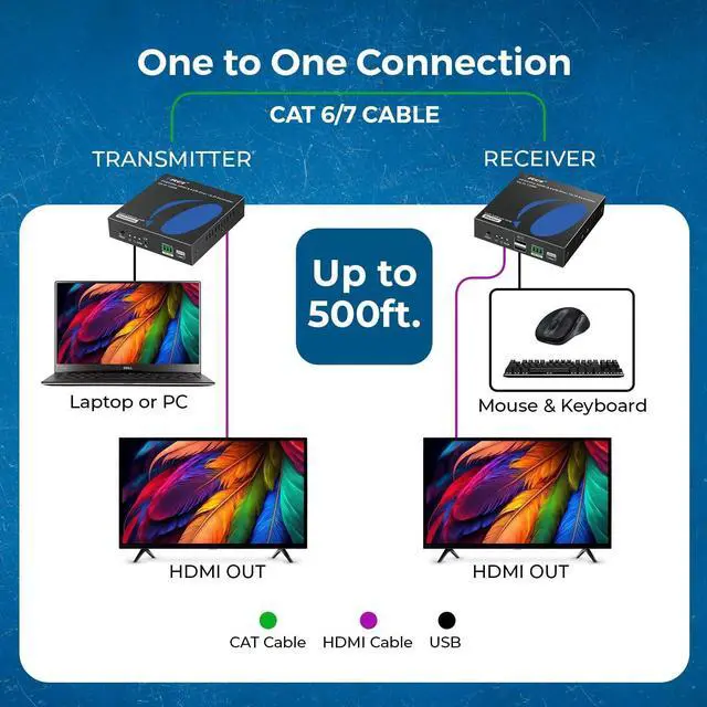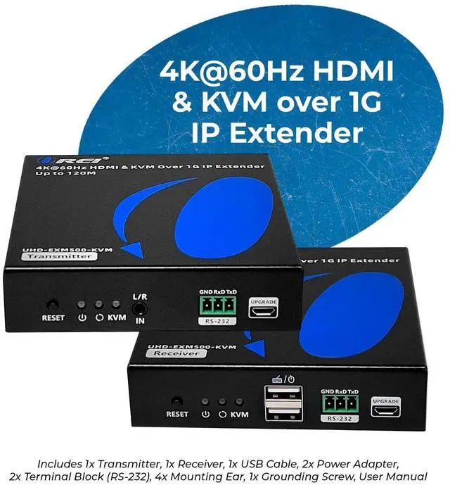^^ KVM Feature: 2 USB 1.1 Ports, Supports Keyboard and Mouse USB. High Quality Cat6 Cable Required - This device requires a high quality shielded cat6 cable to operate at its full potential. Also required a 1G Network Switch for 1 to Many Operation. DO NOT RECOMMEND USING FLAT CABLES. ^^ The extender features OREI technology for high-definition and low-latency transmission. The device supports video resolutions upto 4K@60hz. One-way IR Transmission from Receiver to the Transmitter; enabling control of the source device from the receiver end. ^^ 1 to Many Transmission with Low Latency Performance This extender kit can send one-to-one signals through a single transmitter and receiver, or send one-to-many signals through an Ethernet Network switch. Control 1 PC remotely through more than one location. HDMI Loop Out Additional HDMI Output on the Transmitter end allows you to add a local display for monitoring. Supports HDMI 4K @ 60Hz 4:4: 4, 480i 60Hz, 480p 60Hz, 576i 60Hz, 576 50Hz, 720p 50/60Hz, 1080i 50/60Hz, 1080p 50/60Hz; No driver installation required. ^^ Package Includes - HDMI Transmitter, HDMI Receiver, IR Cables, Manual, 2x Adapters. Full OREI Support - 1 Year Warranty