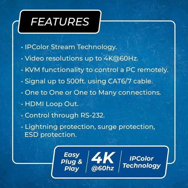 HDMI Over IP: Extends USB & HDMI signals up to 400 Feet (120 meters) at full 4K 4:4: 4 @ 60hz by a Cat6 cable. Either Point to Point connection, or One to Many Connection (sold separately) over 1G Network Switch (sold separtely). RS-232 Support. The device comes with a dual voltage supply using a US plug, and an adapter/converter is provided for international use.