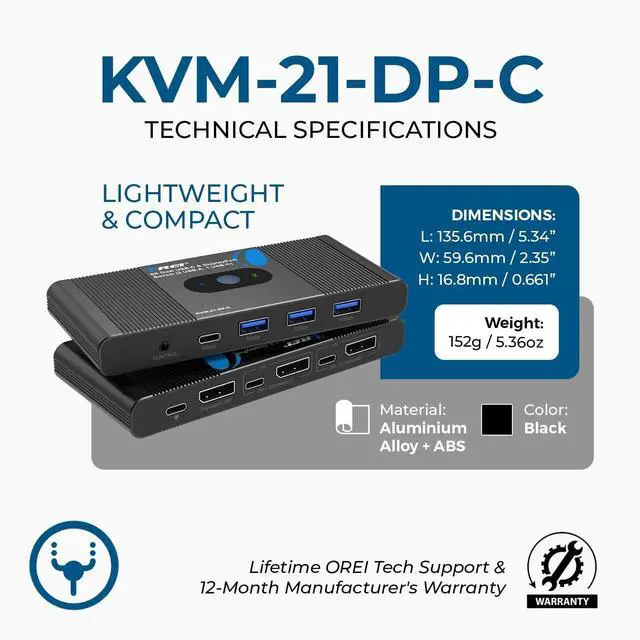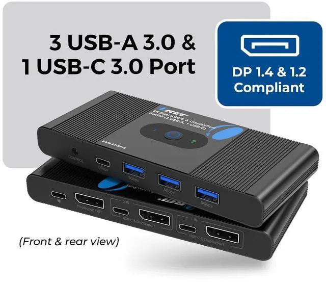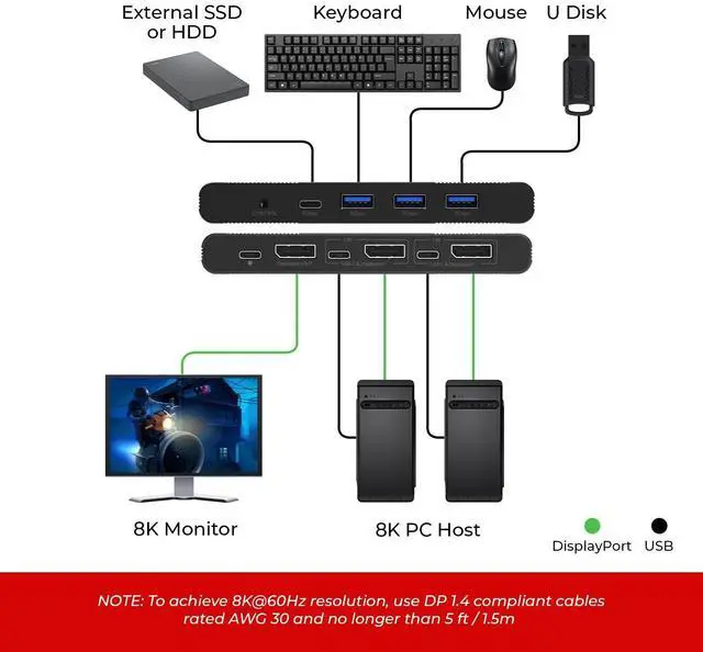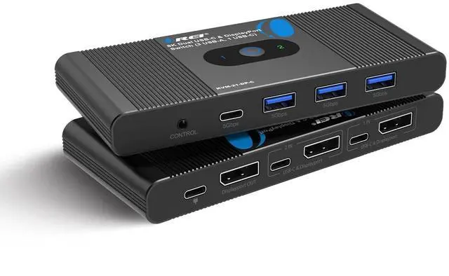8K DisplayPort KVM Switch for 2 Computers 1 Monitor Share one display or projector between two DisplayPort or USB-C enabled PCs using this 8K KVM switch, supporting 8K@60Hz and 4K@120/144/240Hz with DP 1.4 compliance and up to 32.4G bps bandwidth. ^^ Advanced USB-C & DisplayPort KVM Switching Features 2x DP + 2x USB-C host inputs, allowing seamless switching between laptops and desktops. Ideal as a DisplayPort switch 2 in 1 out for workstations, creators, and gamers. ^^ USB 3.0 Hub for Keyboard, Mouse & Peripherals Includes 3 USB-A 3.0 ports and 1 USB-C 3.0 port (5Gbps) to share keyboard, mouse, flash drives, SSDs, and other USB devices between two computers.