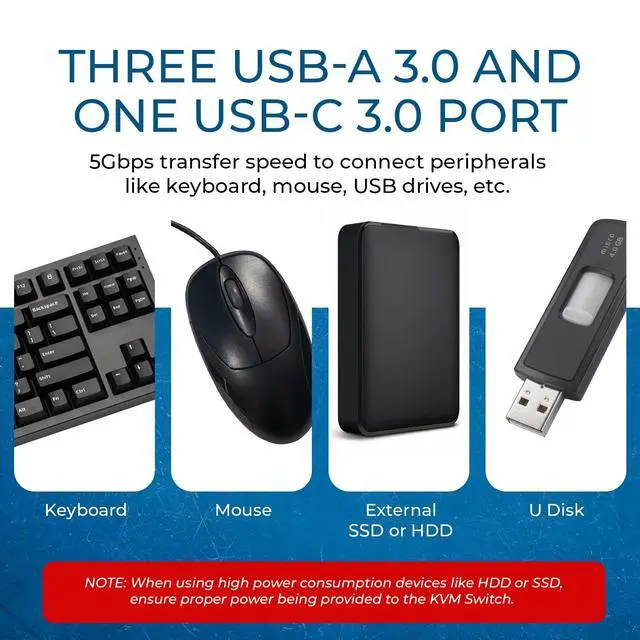 Note: External USB-C power is recommended when connecting high-power devices like SSDs or HDDs.