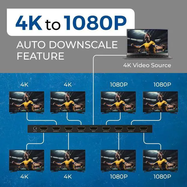 Displays: The UHD-PRO108 HDMI Splitter duplicates a single HDMI sourceTV box, DVD player, gaming console, or computeracross up to 8 display devices simultaneously. Ideal for bars, restaurants, churches, gyms, offices, or any space requiring one content source on multiple screens. The device comes with a dual-voltage power supply using a US plug, plus an adapter/converter for international use.