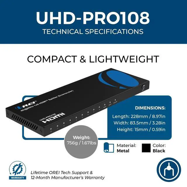 Package & Warranty: Includes 1 x UHD-PRO108 1-in-8 HDMI Splitter, 1 x Power Supply, and 1 x User Manual. Backed by a 1-Year OREI Warranty with full technical support for peace of mind.