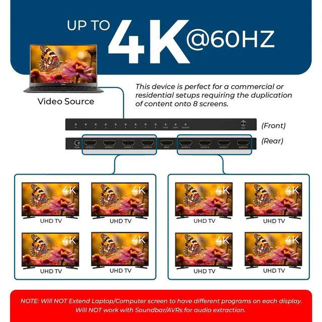 ^^ Full Audio Compatibility: Supports LPCM, Dolby-AC3, DTS 7.1, DSD, Dolby TrueHD, and DTS-HD Master Audio. Enjoy immersive, high-quality audio on all 8 connected displays, covering essentially all HDMI audio formats. ^^