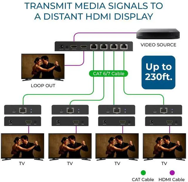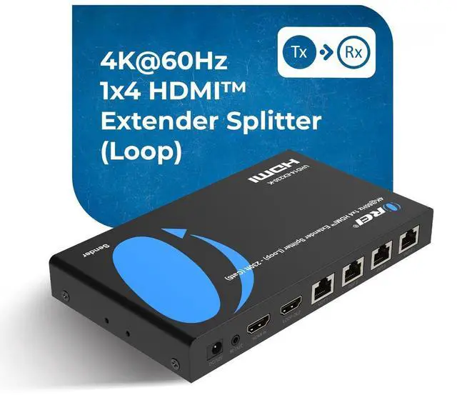 4K@60Hz HDMI Over Ethernet Distribution Seamlessly transmit one HDMI source to four HDMI displays over a single CAT6/7/8 network cable up to 230 ft; built-in splitter with HDCP 2.2, EDID management, loop-out and ultra-low latencyno external switcher required. The device also comes with a dual voltage supply using a US plug, and an adapter/converter is provided for international use. ^^ Dual-Range 4K HDMI Extension Transmit true 4K@60 Hz up to 200 ft or 4K@30 Hz up to 230 ft over a single CAT6/7 network cable; HDMI transmitter features 4 RJ45 outputs plus 1 HDMI loop-out for local monitoring, with HDCP 2.2, EDID management, and ultra-low latency.