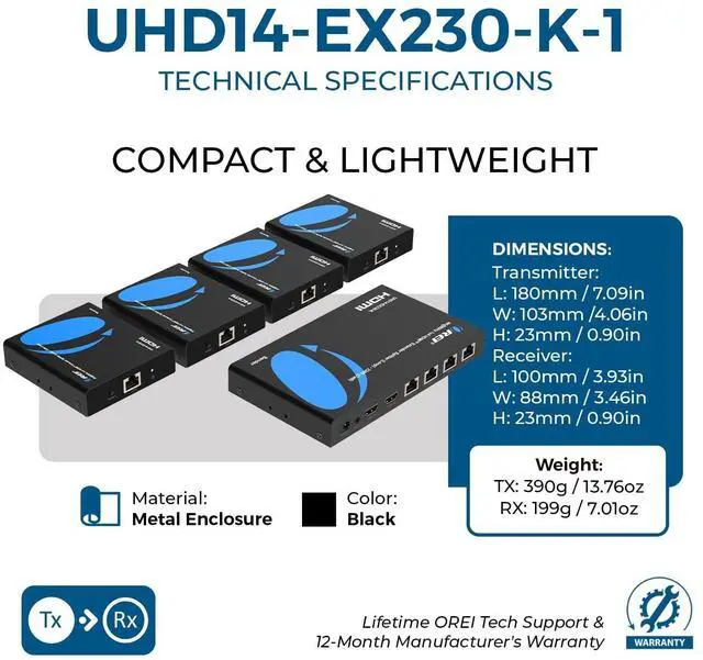 ^^ Complete Extender Kit & 1-Year Warranty Everything you need in one package: 1 HDMI transmitter, 4 HDMI receivers, 1 power adapter, 10 mounting ears, IR-In & IR-Out cables, and a user manual; backed by a 1-year OREI manufacturers warranty for reliable AV distribution.