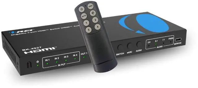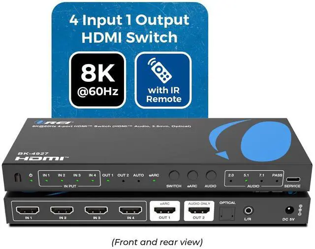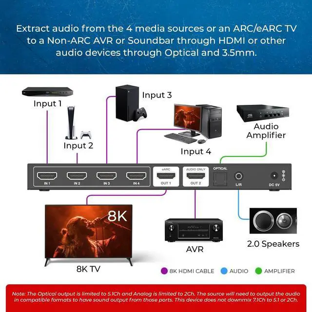 4x1 HDMI Switcher with eARC Audio Extraction Switch four sources while extracting audio. Does not extract eARC audio to soundbar. The device comes with a dual voltage supply using a US plug, and an adapter/converter is provided for international use. ^^ HDMI Audio Extractor with eARC/ARC Conversion HDMI 2.1 (48Gbps) & HDCP 2.3 with HD resolutions including 8K@60Hz 4K@120Hz 4K@60Hz 2K@60Hz along with HDR10+ Dolby Vision HLG. Extract & convert it to HDMI audio for older AV receivers without eARC support. ^^ HDMI Audio-Only Output + Optical & L/R Audio Extraction Made with a dedicated HDMI audio output to connect to AV receivers for full-bandwidth audio formats including Dolby Atmos, Dolby TrueHD, DTS-HD Master Audio, DTS Digital Surround, Dolby Digital & LPCM 7.1 / 5.1 / 2.0 ^^ eARC Mode Support Extracts Audio return from the ARC/eARC port on your TV/Display & send HDMI audio only to a non-ARC AV Receiver for a full home theater experience.