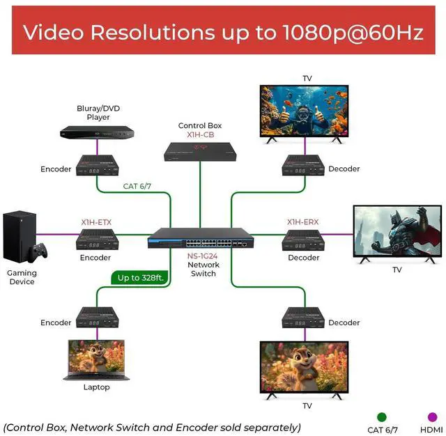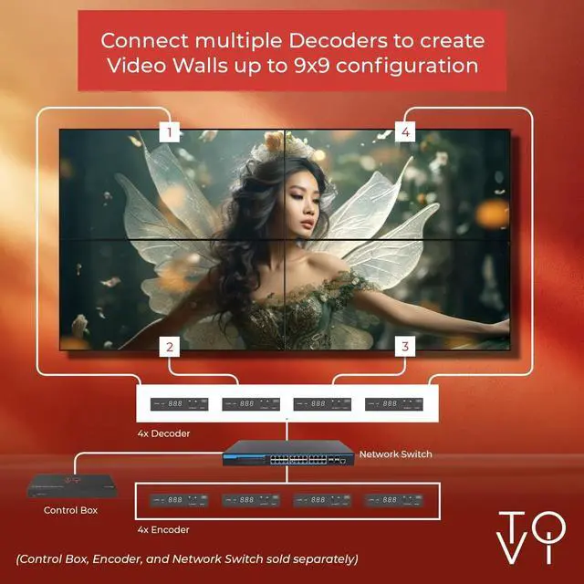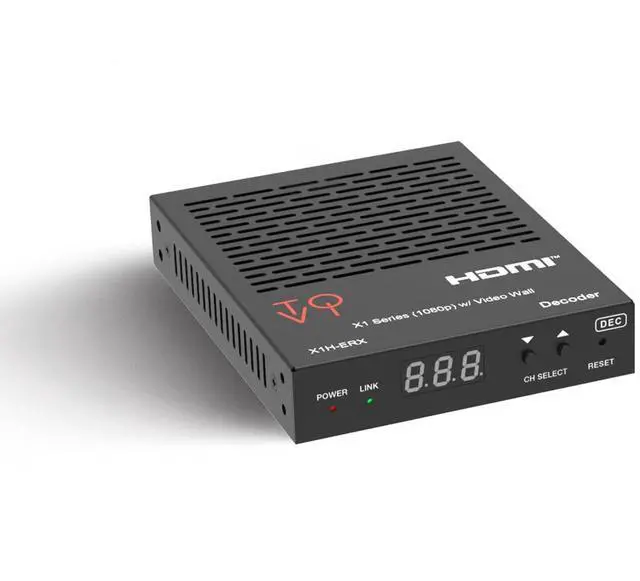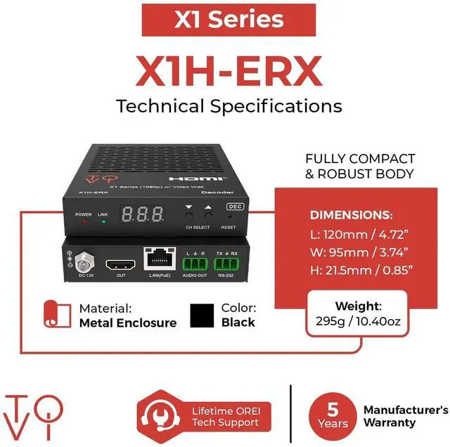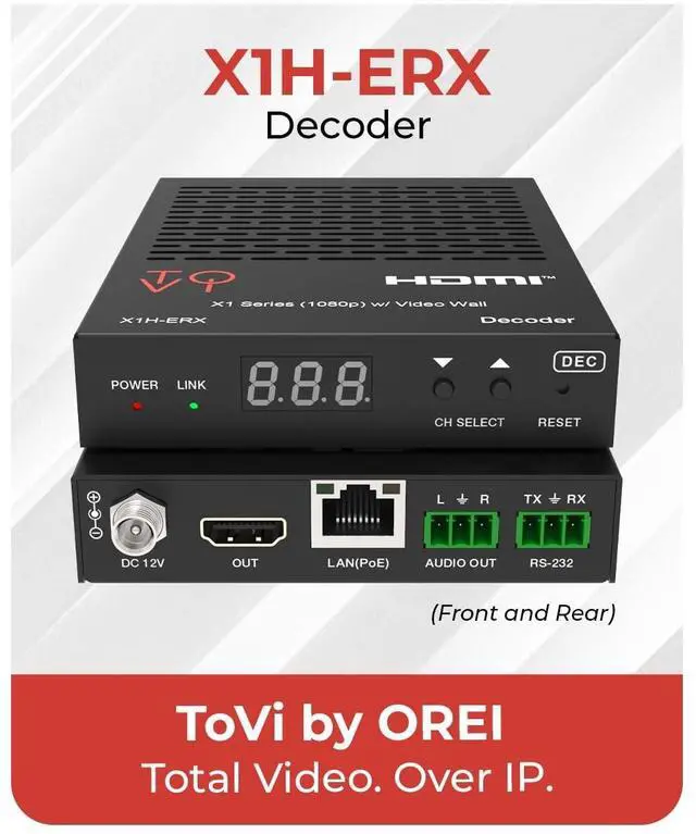 ToVi X1 Series 1080p HDMI Over IP Receiver (X1H-ERX) This receiver unit connects to your display and pairs seamlessly with X1H-ETX transmitters (sold separately). Supports multi-room and multi-device 1080p AV distribution with low latency; works in point-to-point, one-to-many, or many-to-many configurations using CAT5e/6/6a/7 cables up to 328ft (100m); ideal for digital signage, commercial AV, and control room applications. ^^ Advanced Compression & Signal Integrity Compatible with H. 265/H. 264 compression from the transmitter, ensuring high-quality video up to 19201200@60Hz 4:4: 4 with minimal bandwidth usage and pristine image quality across the network. ^^ Comprehensive Audio & Control Features Supports audio embedding/extraction, RS-232 control, and integration with the X1H-CB Control Box for centralized management of multiple transmitters and receivers. Ensures flexible, secure, and scalable AV distribution. ^^ Video Wall & Network Flexibility Supports up to 99 video wall configurations with MJPEG sub-stream previews. Compatible with PoE-enabled networks, allowing easy deployment without extra power adapters. ^^ Package Includes & Compatibility Includes 1x X1H-ERX Receiver and 1x User Manual. Fully compatible with X1H-ETX transmitters and centralized management via X1H-CB Control Box and ToVi NS-1G24/NS-1G48 Network Switches (all sold separately).