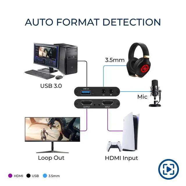FULL HD 1080P @ 60hz VIDEO CAPTURE Capture crystal-clear video in 1080p recording through USB-A from HDMI sources including PS5, PS4, Xbox One, Xbox 360, Wii U, Nintendo Switch, DSLR cameras, security cameras, set-top boxes, and DVD players with 4K 60Hz ( 4:2: 0) or 4K@30hz. Ideal for live streaming, recording gameplay, video conferencing, and content creation. ^^ EASY SETUP WITH OBS SOFTWARE Works instantly with user-friendly OBS software available online and requires no external power. The device is automatically recognized as a webcamsimply connect and approve the source for quick setup. Supports optional audio capture, automatic input detection, CPU-efficient operation, and smooth, freeze-free streaming when properly configured. ^^ WIDE SYSTEM & SOFTWARE COMPATIBILITY Fully compatible with Windows and macOS and supports popular streaming and recording platforms including OBS, Twitch, YouTube Live, Facebook Live, Twitter, PotPlayer, and VLC. High-speed USB 3.0 interface delivers low-latency transmission for professional-quality live broadcasts. ^^ HDMI LOOP-OUT FOR ZERO-DELAY GAMING Built-in HDMI loop-out lets you view your gameplay in real time on a TV or monitor with no lag, while simultaneously capturing the video on your computer, perfect for competitive gaming, walkthroughs, tutorials, and esports streaming. Also Headphone 3.5 Stereo Out. ^^ MIC-IN FOR LIVE COMMENTARY Includes a 3.5 mm TRS microphone input for adding voice commentary during gameplay or live sessions.
