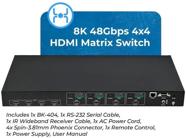 ^^ Includes: 4x4 8K Switcher Matrix, Power Adapter, IR Remote Control, RS-232 Cable, Mounting Ears, Operation Manual, 1-Year Warranty, and Full OREI Support.