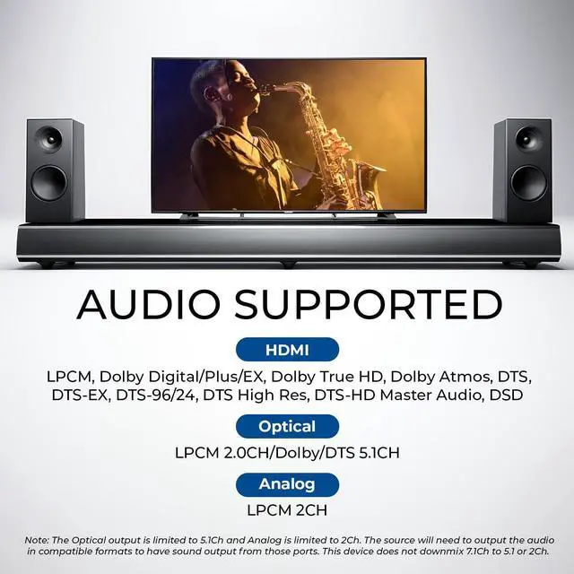 8K HDMI 4 input into 4 output Matrix Switcher with Audio Extractor through Optical or Analog. This device will not extract audio through HDMI. Supports 8K to 4K downscaling for each output port. ^^ 8K Matrix Switcher Selector is compatible with all operating systems such as Windows, Mac OS, and Linux. Also works perfectly with Logitech Harmony, Xbox One X, PS5, Roku 4, Fire TV, Blu-ray players, projectors, etc. Does NOT extract for Sonos-ARC/e-ARC soundbars.