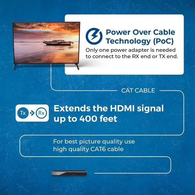 4K HDMI Extender Balun - Long Range Over CAT5e/6/7 LAN Cable up to 400 Feet with Zero Latency ^^ HDBaseT Technology for lossless and lag-free video transmission ^^ Bi-directional IR control enables source device to recognize remote commands from remote display or control the remote display from the source device ^^ Supports HDMI 2.0 a HDCP 2.2, UHD 4K/60Hz, 2K@60Hz