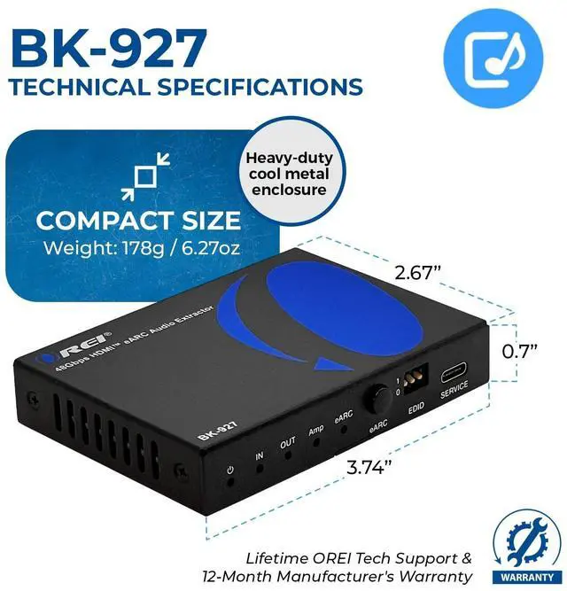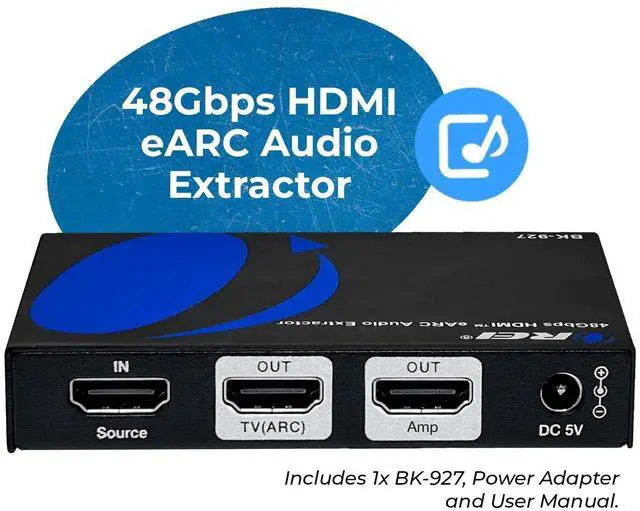 @ 50/60Hz (YUV 4:4: 4) HDR, DVI Compliant. Convert TV eARC/ARC audio to any HDMI input audio system - Extract full audio from your 4K HDMI source such as cable box or gaming system and send the 4K HDR video to the TV and enjoy the full home theater audio with your older HDMI audio receiver ^^ Dedicated HDMI Audio only output to connect to an AV Receiver supports Dolby Atmos, Dolby True HD, Dolby Digital, DTS Digital, DTS HD Master, Dolby/DTS 7.1 & 5.1CH, PCM 7.1 & 5.1 & 2.0 stereo audio) Support VRR, ALLM, QMS, QFT, SBTM, as specified in HDMI 2.1. ^^ eARC Mode Support - extract the audio return from ARC or eARC port on TV/Display and send HDMI audio only to a non-ARC AV Receiver for full audio experience. ARC Audio Extracton from an ARC/eARC TV.. The device comes with a dual voltage supply using a US plug, and an adapter/converter is provided for international use. ^^ Full 1 Year Warranty from OREI, Includes: User Manual, 100-240V Power Adapter, BK -927 Audio Extractor