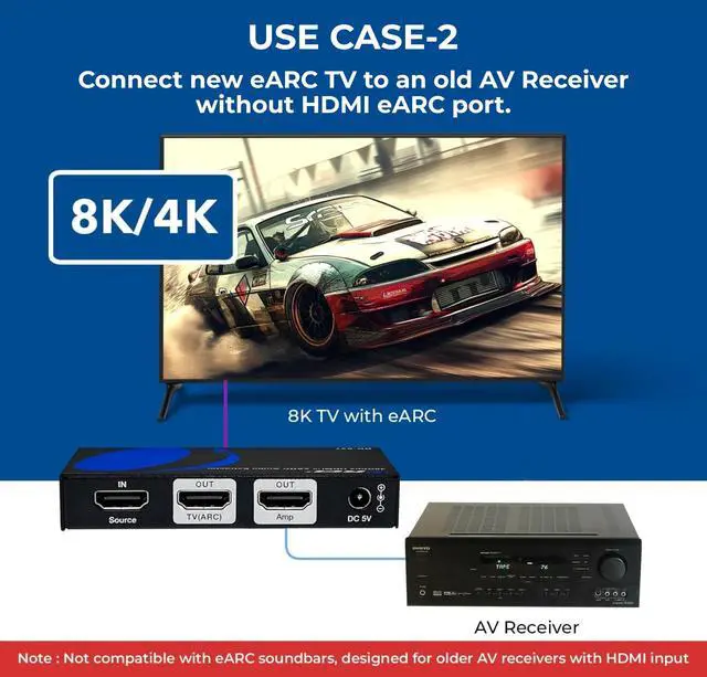 Audio Extractor: Extract full HDMI audio from any HDMI source signal and pass-through 8K or HDR the video to a compatible display/TV and output HDMI Audio to AV Receiver with HDMI input and get full eARC capabilities on your AV receiver. Will not extract eARC to your Soundbar ^^ 4K Ultra HD Support - HDMI 2.1 (48Gbps), HDCP 2.2 compliant, supports resolutions up to 8K @ 60hz, 4K @ 120hz, 4K