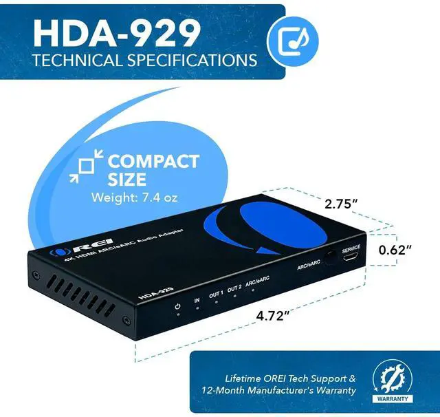 ^^ Package Includes: HDA-929 Audio Extractor, 100-240 V Power Adapter, User Manual, and 1-Year Warranty with Full OREI Support. ^^ Surge protection device This product contains sensitive electrical components that may be damaged by electrical spikes, surges, electric shock, lightning strikes, etc. Use of surge protection systems can help protect your equipment and extend its service life. For any technical issues, please refer to page 3 of the manual for detailed guidance.