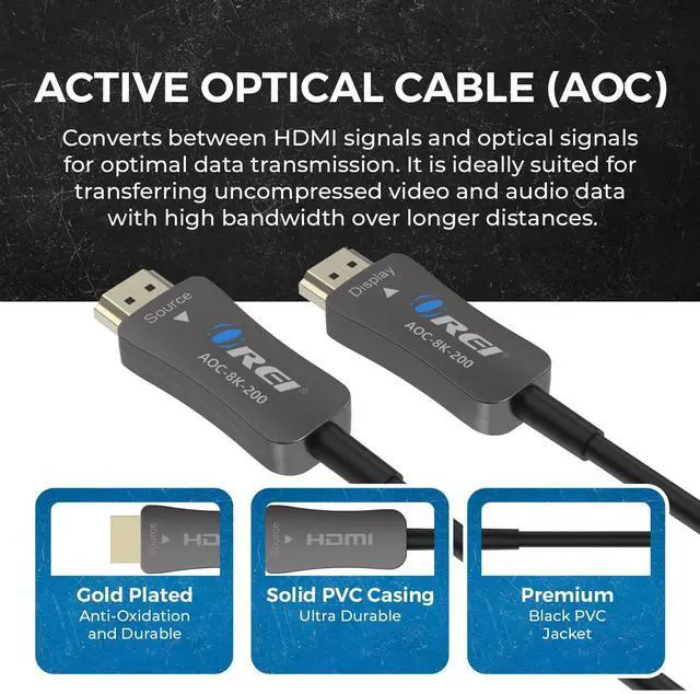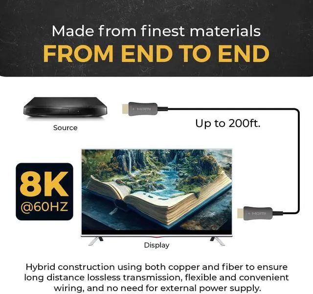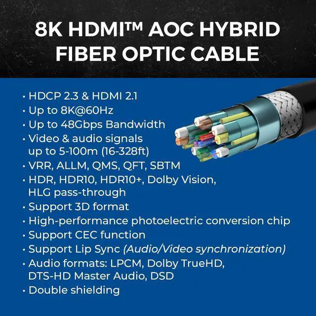 ^^ Optical Fiber Performance: Active optical fiber technology maintains full HDMI 2.1 performance across long distances with no compression, signal loss, or latency.