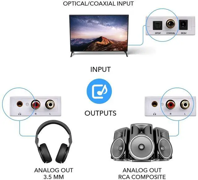 ^^ TROUBLESHOOT: Signal from the TV goes into SPDIF (Optical), or Coxial input of the DA34 and The output of RCA or Headphones will go into your analog speakers or headphones. Make sure the power adapter is connect properly. And all the cables are inserted all the way in. If there is still no sound, please change the TV Audio out to PCM Only from the TV Menu.