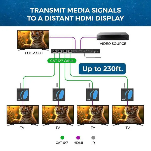 Distribute 1 HDMI Source to 4 HDMI displays over Cat6 network cable simultaneously, 1 in 4 out splitter receivers with power over cable feature and 4K@30Hz upto 165 ft - no adapter needed to power the receivers. ^^ HDMI Transmitter is equipped with 4 port Cat6 output. And 1 additional HDMI output to connect to a local display or monitor. ^^ IR Remote Control. Supports 2060Hz IR pass back, control a DVD player or other HDMI video source from a remote location with the included IR cables that forward commands over a dedicated DDC Channel.