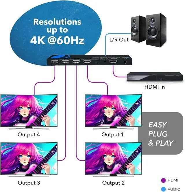 OREI 1 input (1 Source) to 4 Output (4 Display) Supports HDMI 2.0 with EDID1 HD Source in to 4 HD Display - Supports Version 2.0 - Splitting one HDMI input signal into two HDMI output signals identical to the input signal. The device comes with a dual voltage supply using a US plug, and an adapter/converter is provided for international use. ^^ Resolutions up to 4K x 2K @60Hz, You are able to Scale resolutions to match your TVs. UHDS-104A also supports HDMI 1.4, 1.3, 1.2. ^^ Compatible with HDMI units such as Roku 4, 4K TV, Fire TV, Ultra Projector, PS4, Xbox, Apple TV, HDMI LCD, Cable box, Blu-ray player, DVD player, PC, STB and more.